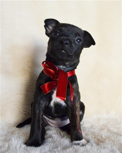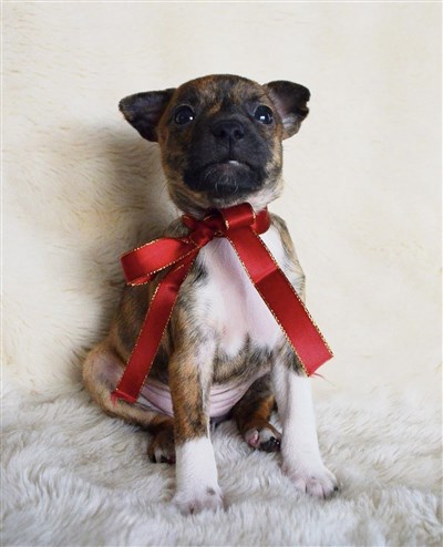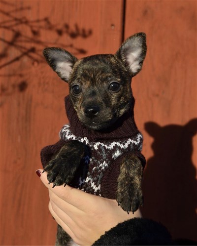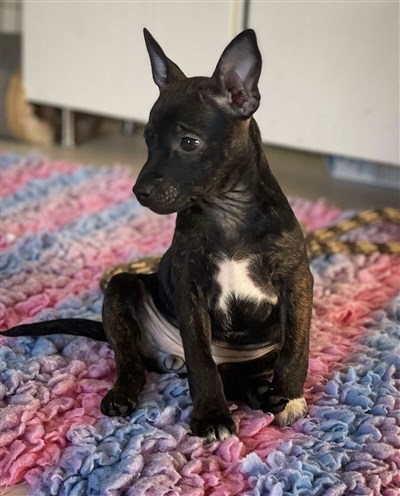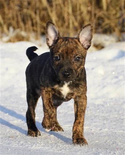 Brindle, samt svarta m vita tecken på bröst & tassar
